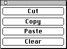 While you're editing menus, you may not have access to an Edit menu and its Cut, Copy, Paste, and Clear commands. MCL provides a palette with these controls during menu editing.