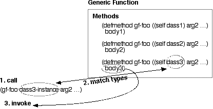 Note that the parameter types do not have to be CLOS class types. If you want to specialize a method to one particular CLOS class, you can specialize one of the arguments to that class, as we saw in the first figure in this chapter. If you have specialized one parameter to a CLOS class, and leave the other parameters unspecialized, then you've emulated the single-dispatch method common to certain "classic" object-based programming languages. In this limited case you can think of a method as being associated with a class. We'll see in the next section that this association breaks down when we associate a method with multiple classes.