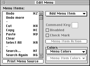 While you're editing menus, you may not have access to an Edit menu and its Cut, Copy, Paste, and Clear commands. MCL provides a palette with these controls during menu editing.