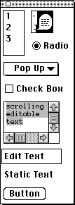 In addition to the programmer's interfaces to the Macintosh OS, MCL also provides a tool for visual construction of user interface elements. The Interface Toolkit lets you design windows and dialogs by simply specifying a particular type of new window, then dropping user interface elements into the window. The Interface Toolkit also provides an editor for menus. When you are satisfied with the appearance of your new window or menu, the Interface Toolkit will emit the Lisp code needed to reconstruct it from scratch.